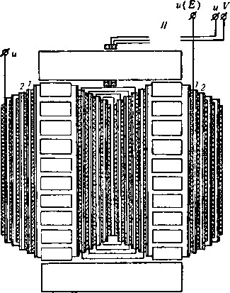 圖3-2是消弧線圈的鐵心和線卷的草圖,其線卷一般系采用層式結(jié)構(gòu),這對于線卷的絕緣是有利的。線卷的第一層1和第二層2能夠斷開,亦能串接或反接。在鐵軛上裝有測量線卷,由于主線卷的匝數(shù)要改變,所以測量線卷也具有分接頭,以便得到合適的變比。